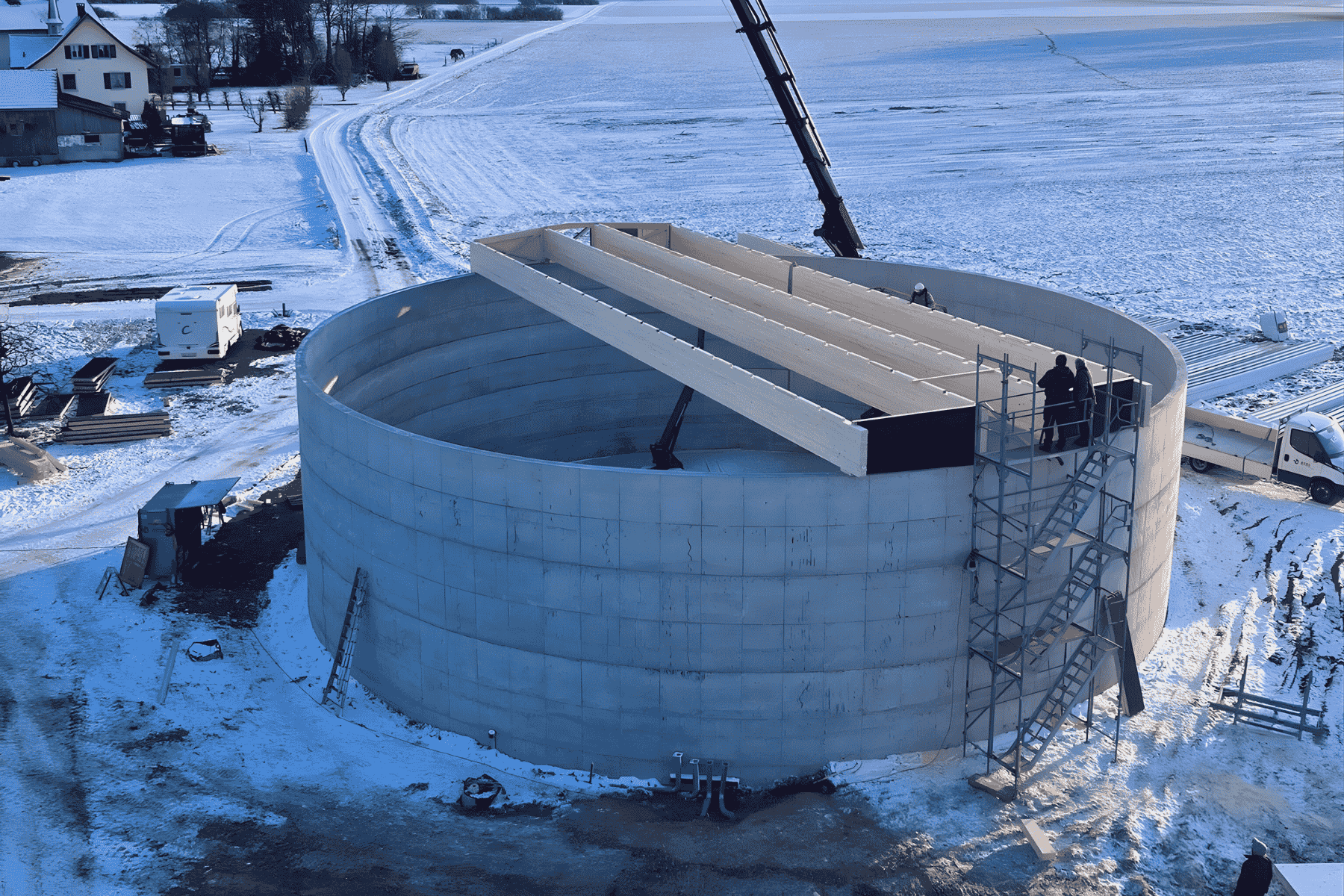 Stahl-Beton, 120mm vorgebogene Aussenisolation direkt in die Schalung eingelegt, Heizleitungen in Boden und Wand